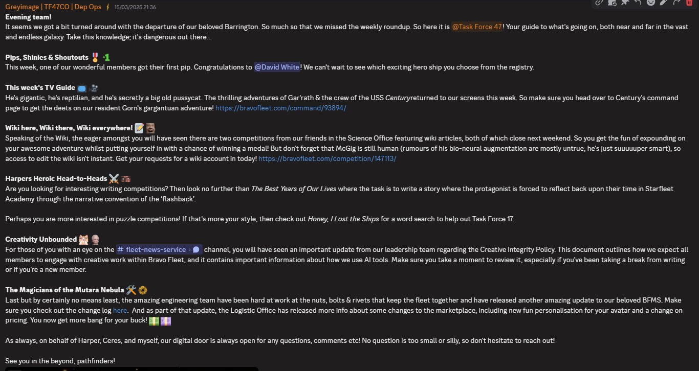 • Do try take inspiration from the goings on and events of the fleet. Perhaps with the launch of a new campaign or intel briefing your activities take on a different flavour for a few weeks. Inspiration is out there!
