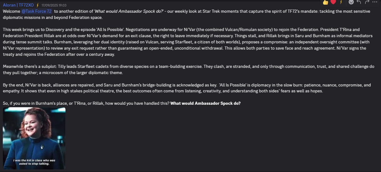 A thoughtful discussion format: present a moral or strategic dilemma — ideally based on a Star Trek episode — and ask members how they would solve it.