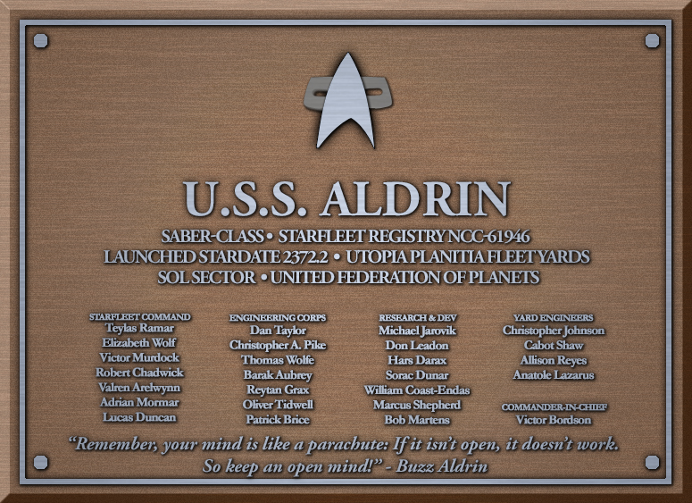 USS Aldrin NCC-61946 is a Saber-class Federation starship currently assigned to Fourth Fleet's Fleet Operations.