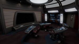 With the later Nebula-class starships sharing an identical saucer section with the Galaxy-class, the main bridge of the Farragut represents an evolution of the proven Galaxy-class configuration, refined with advancements in Starfleet starship design. Along the outer perimeter—working clockwise from the forward viewscreen stood the stations for mission operations, operations, environmental control, the master systems display, and multiple engineering stations.