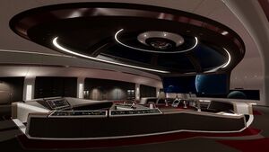 From the bridge, access can be gained to the larger-than-normal captain's ready room (this is on the starboard side of the ship) as well as access to three turbolift shafts (two on the port side and one on the starboard side). The Odyssey's observation lounge is located in front of the bridge module; as such, two doors can be used to take a small ramp on either side to enter this large room. Behind the bridge sits access to an equipment storage area, along with four escape pods and the deck one airlock. Located on the port side of the bridge is a small staff break room that also leads into an anteroom. This space is normally used by those who may be pulling a double shift or require a short rest break.