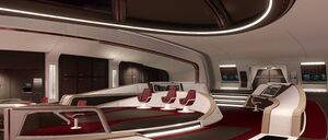 Two decks tall, the yacht comes with some unique features that provide a source of luxury for those onboard. Deck 1 has a large reception hall with a small lounge attached to it, along with a small transporter pad. A galley and a bar allow for VIP guests to be treated to replicated and non-replicated food and drink. To access deck two, there are three sets of stairs, and one of them heads up to the cockpit. On deck two, the forward section is inhabited by a cockpit, which is almost the same size as a runabout cockpit. On either side of it are cabins, and then around the edge, three rooms are dedicated to the cargo hold, four for guest quarters, two more rooms in the aft section are for the crew to share, and one more room is given up for the crew as a small break area when guests are onboard. A small sub-deck under deck two, which is mainly made up of access tubes, is dedicated to engineering systems, including the warp core.