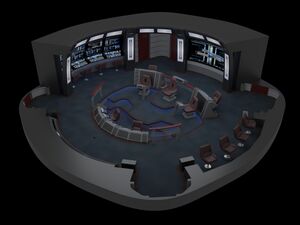 The Main Bridge is located on deck one of the Paramount. Serving as the epicenter for all command decisions made aboard the ship. The bridge design was traditional for Starfleet ships. The captain's chair sat in the center of the bridge, to the right sat the executive officer's chair, and to the left an additional command chair usually reserved by the ship's chief counselor, chief medical officer, or any official or dignitary the Captain sees fit. All three command chairs are made of a deep maroon textile and are surrounded by two consoles located directly behind for the tactical and science consoles respectively. Forward of the command chairs in a lowered part of the bridge is the helm and ops positions.