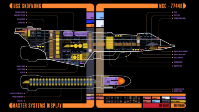 Launched in 2382, Skofnung's construction saw a number of improvements over earlier waves of Saber-Class vessels following review of their performance in the Dominion War and improvements rolled out following Voyager's time in the Delta Quadrant. With partial bio-neural circutry and refitted sensor systems to improve narrow band sensor facilities and exotic scanning capabilities, Skofnung was launched with the a focus on hunting, trailing and securing fugitive starships within Federation territory.