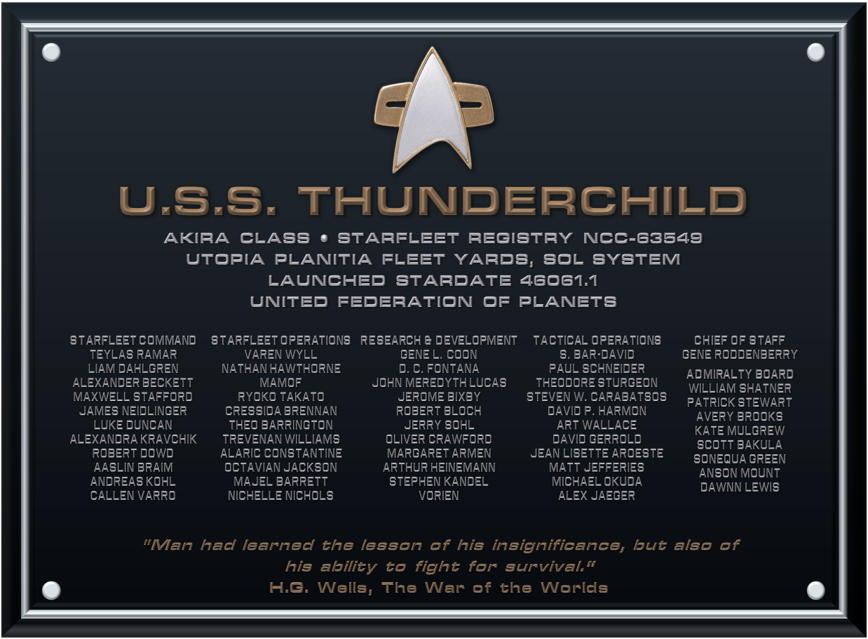 The USS Thunderchild (NCC-63549) is an Akira-class Federation starship renowned for its tactical prowess and resilience over decades. Named after the fictional HMS Thunder Child from H.G. Wells’ The War of the Worlds, which heroically engaged Martian forces to protect civilian ships.