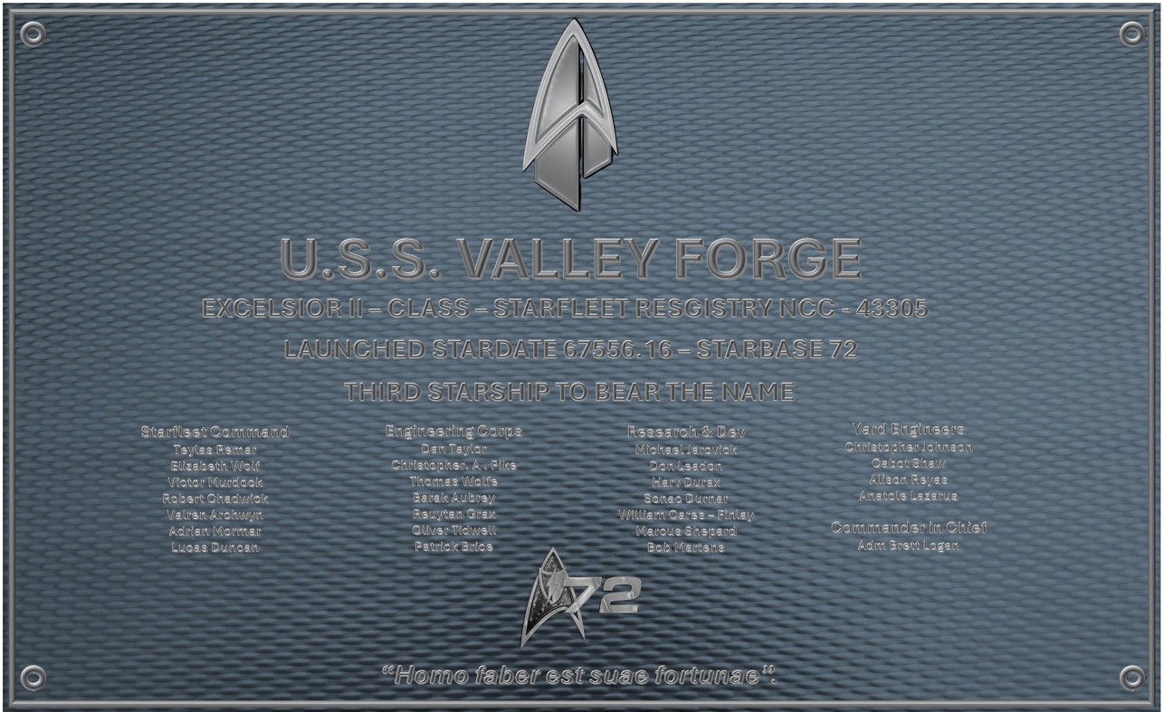 USS Valley Forge NCC-43305 is an Excelsior II-class Federation starship currently assigned to Fourth Fleet's Task Force 93. The Valley Forge was the third to last Excelsior-class spaceframe to undergo the refit and modernization process to upgrade this dependable Starfleet workhorse to be able to support the diplomatic mission of Task Force 72 into the 25th Century and beyond. Nominally deployed to patrol and support duties along the former Cardassian Demilitarized Zone, the operations that the Valley Forge engages in may not be the most glamourous, but her missions are amongst the most vital in supporting the United Federation of Planets during the years that are proving to be some of the most challenging in its entire history.